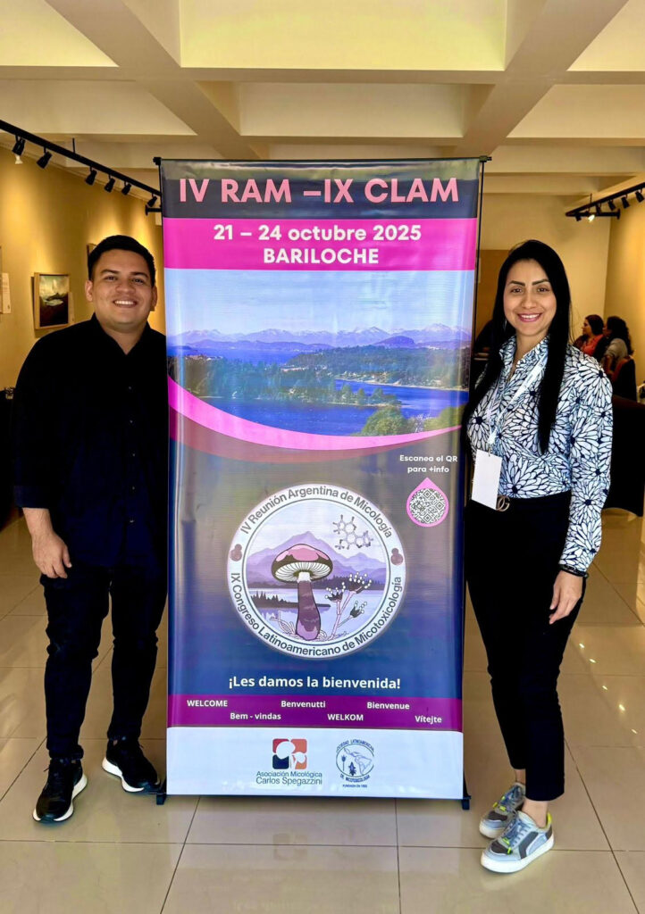 El Becario Doctoral Edgar Martínez Moyano y la pasante Dra. Lyda Constanza Galindo Rodríguez (Universidad de la Amazonía, Colombia), del Laboratorio de Transducción de Señales en Plantas del INGEBI, participaron en la IV Reunión Argentina de Micología y el IX Congreso Latinoamericano de Micotoxicología, realizados del 21 al 24 de octubre de 2025 en la ciudad de Bariloche, Argentina.