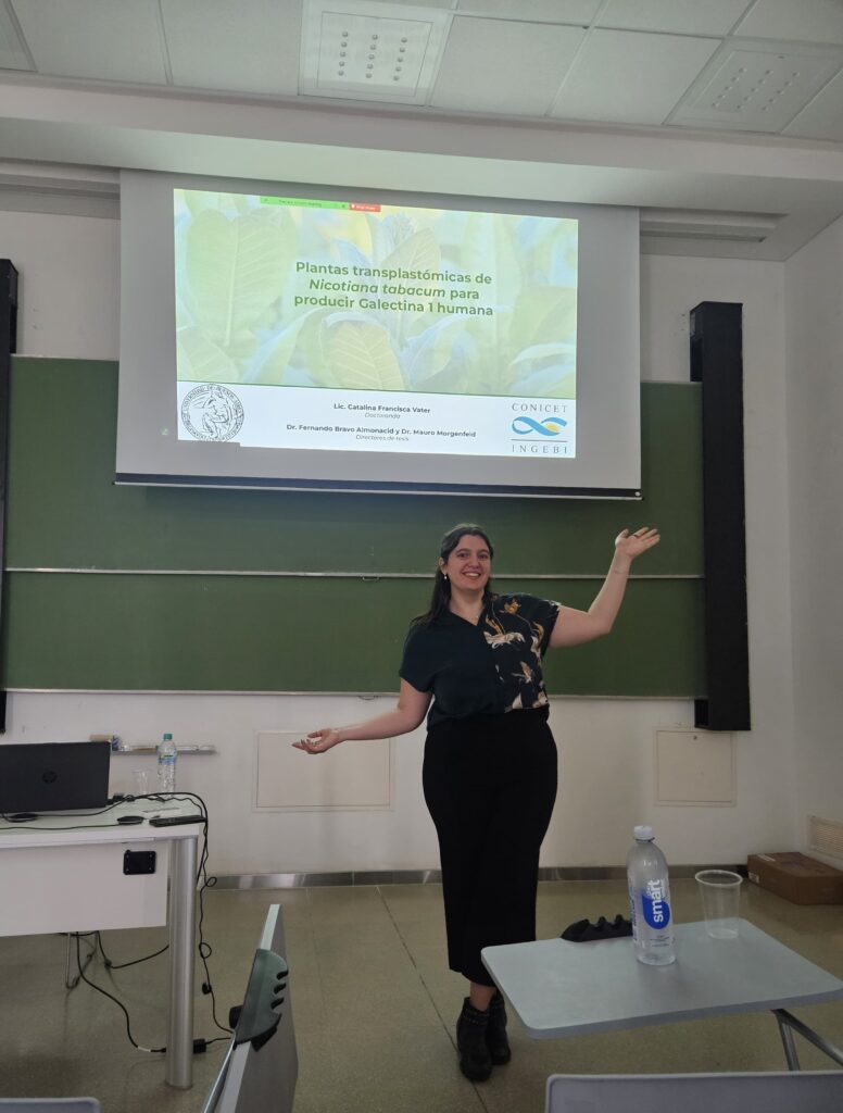El trabajo desarrollado en el Laboratorio de Biotecnología Vegetal fue dirigido por el Dr. Fernando Bravo Almonacid y el Dr. Mauro Morgenfeld, se centró en el uso de plantas como plataforma biotecnológica para la producción de proteínas recombinantes. Bajo el título “Plantas transplastómicas de Nicotiana tabacum para producir Galectina 1 humana”, la investigación abordó el potencial del sistema plastídico como alternativa innovadora y sustentable para la obtención de proteínas de interés terapéutico.